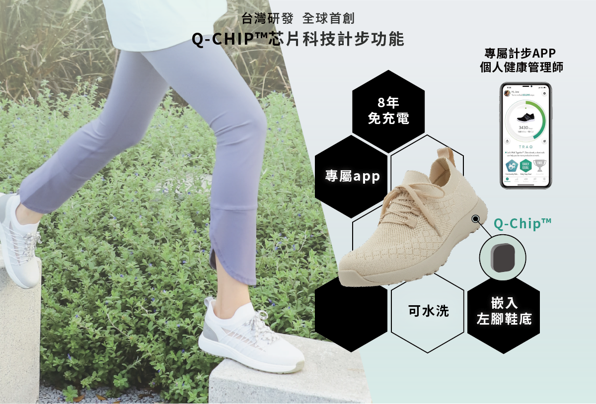「TRAQ」 一雙孕育自美國加州的舒適計步鞋,提供了最完美的解決方案。身為美國前三大舒適鞋品牌, 擁有獨家專利認證鞋墊。